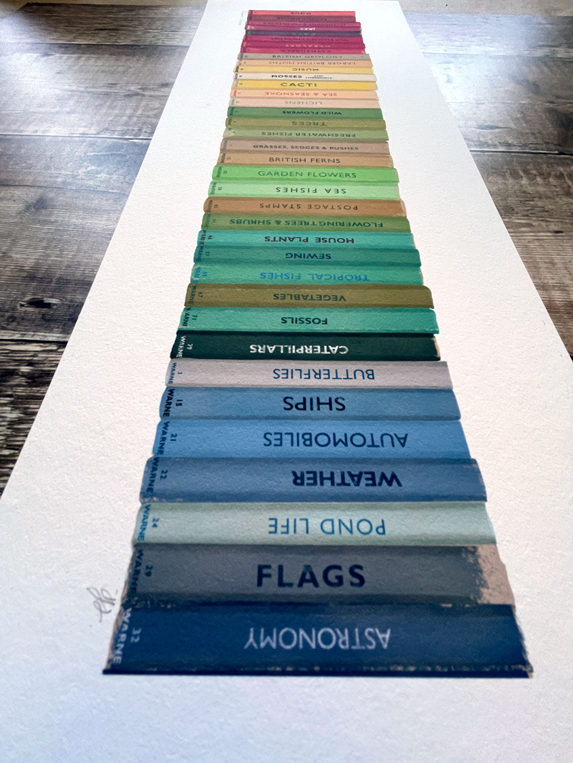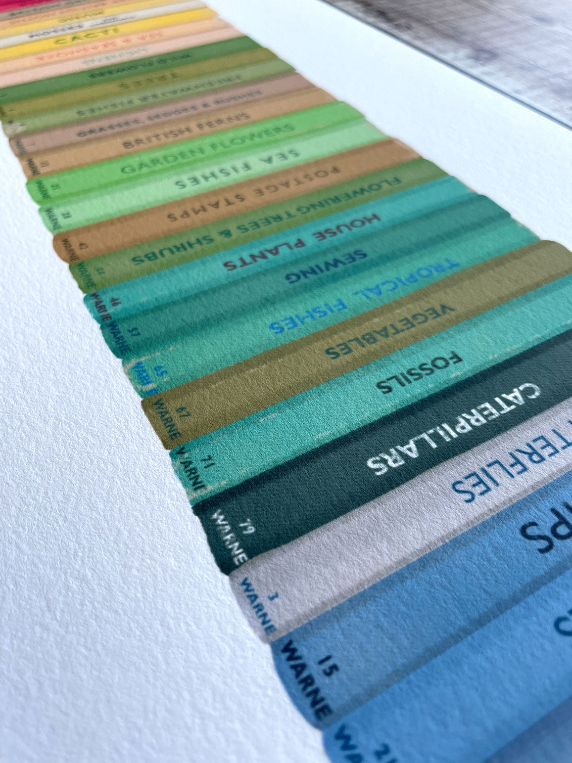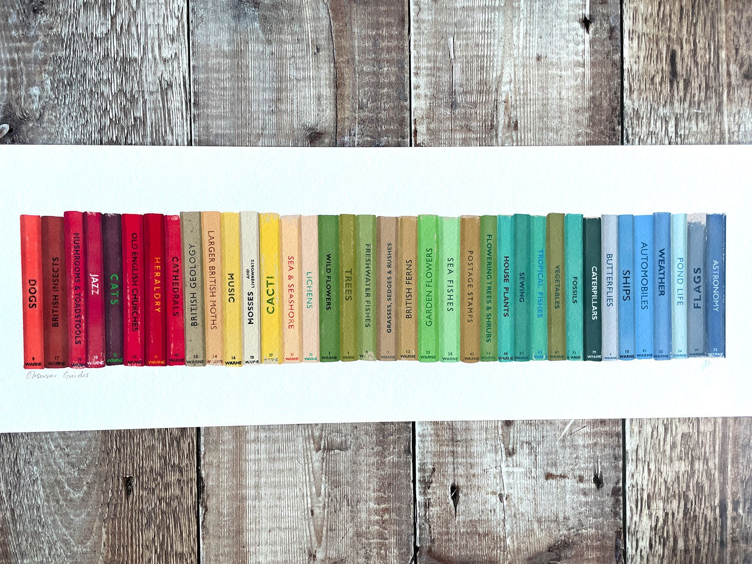 One of my most popular designs this year is back - the original was a metre long but this new version is slightly shorter but equally lovely! It features a rainbow collection of the ever popular Observer books. These were a series of small, pocket-sized books, published by Frederick Warne & Co in the from 1937 to 2003. They covered topics such as hobbies, art, history and wildlife. Intended for children, the aim of these books was to interest the observer.