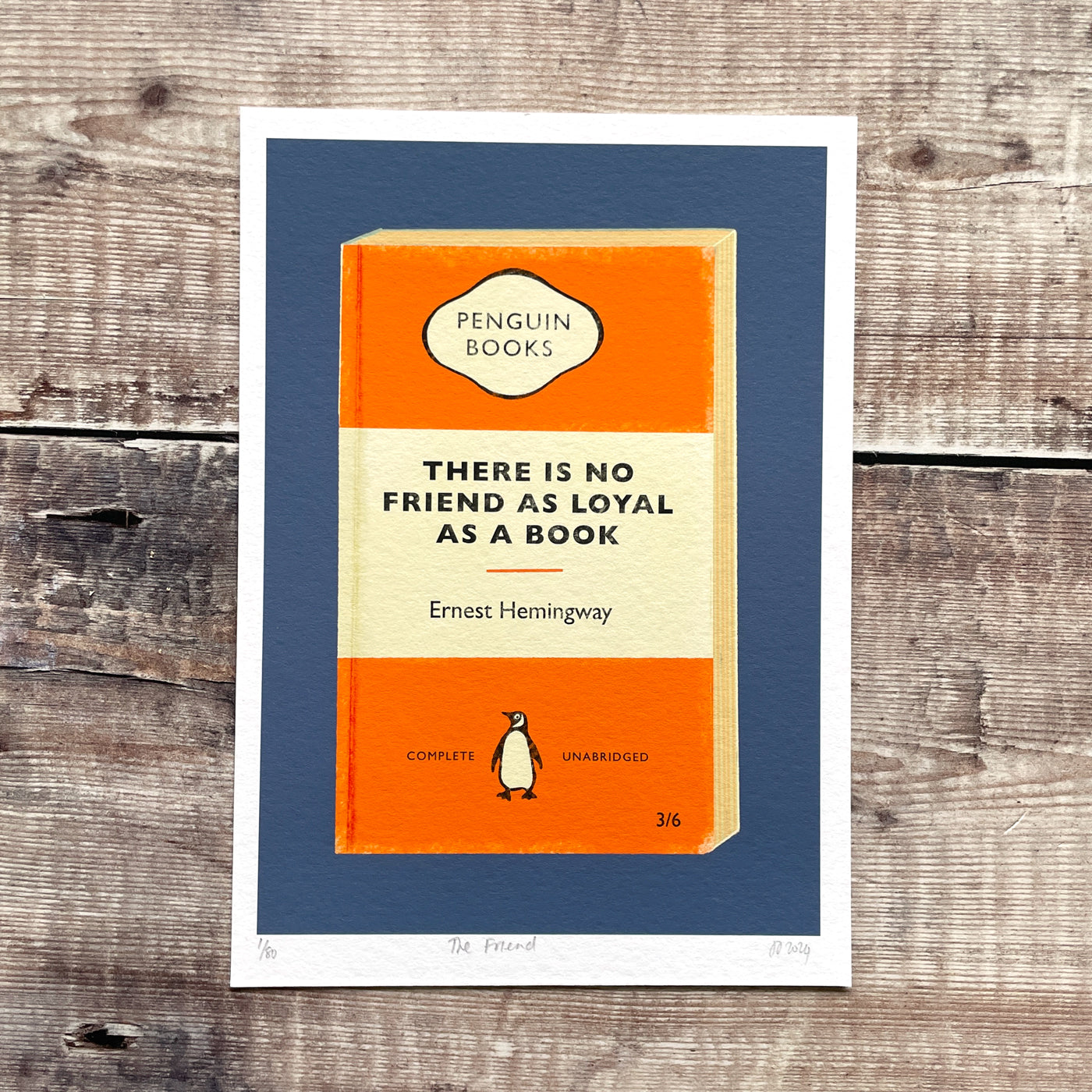 A limited-edition Giclee print featuring a quote from Ernest Hemingway on an iconic Penguin Tri-band style book illustration.