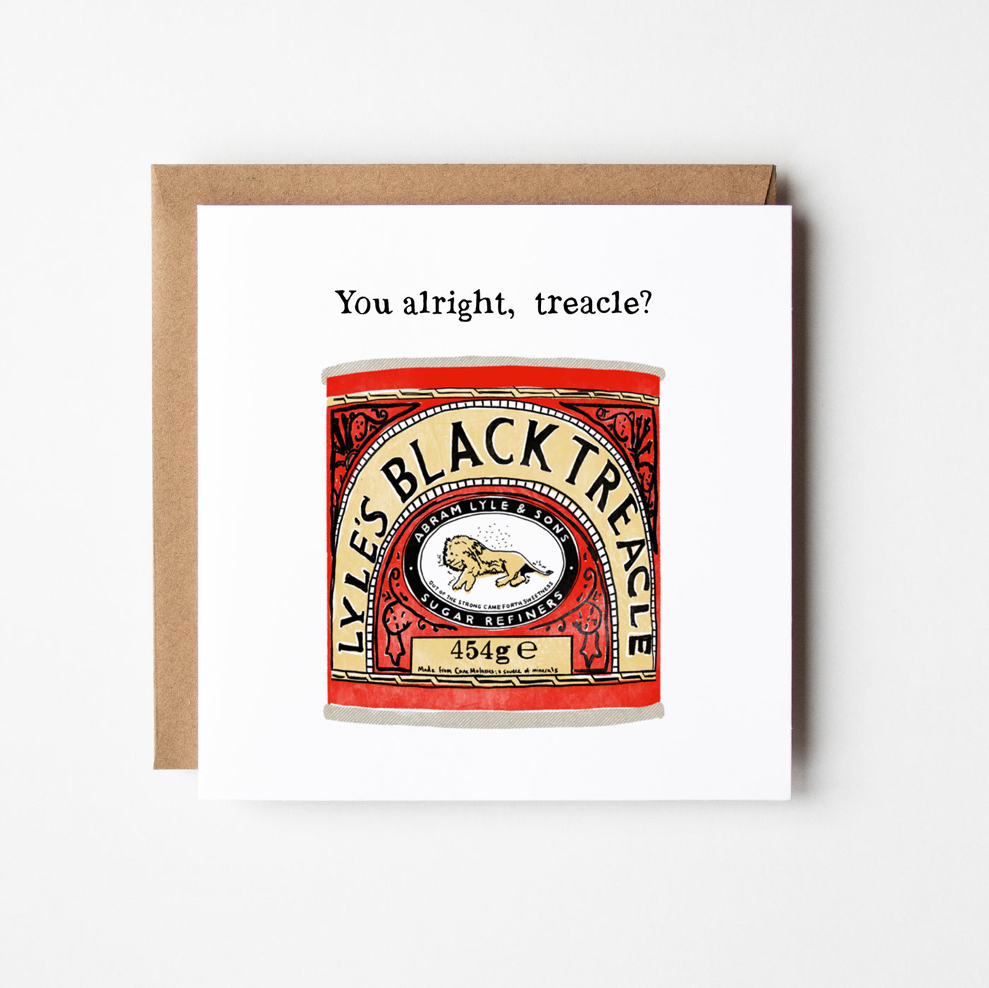 This card features a detail from my original Treacle Tin illustration, showing the iconic black treacle tin with the phrase, “You alright, treacle?”