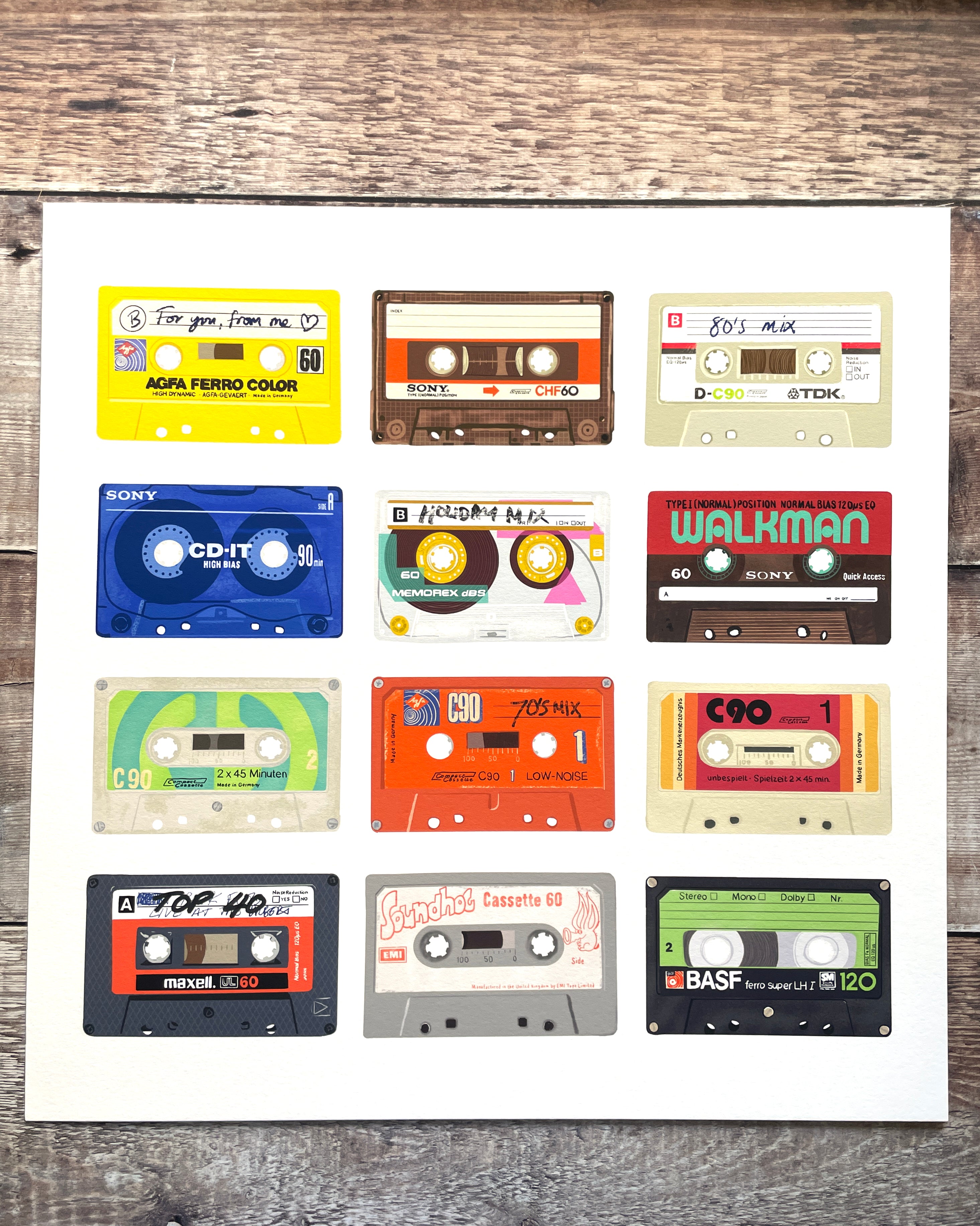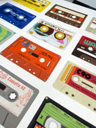 Rewind to the golden age of mixtapes with this hand-drawn collection of classic cassettes from iconic brands including Sony, TDK, AGFA and BASF. Each tape is carefully illustrated to capture the familiar shapes, labels and details that once defined the soundtrack to so many memories. A celebration of analogue culture, creativity and the joy of pressing play.
