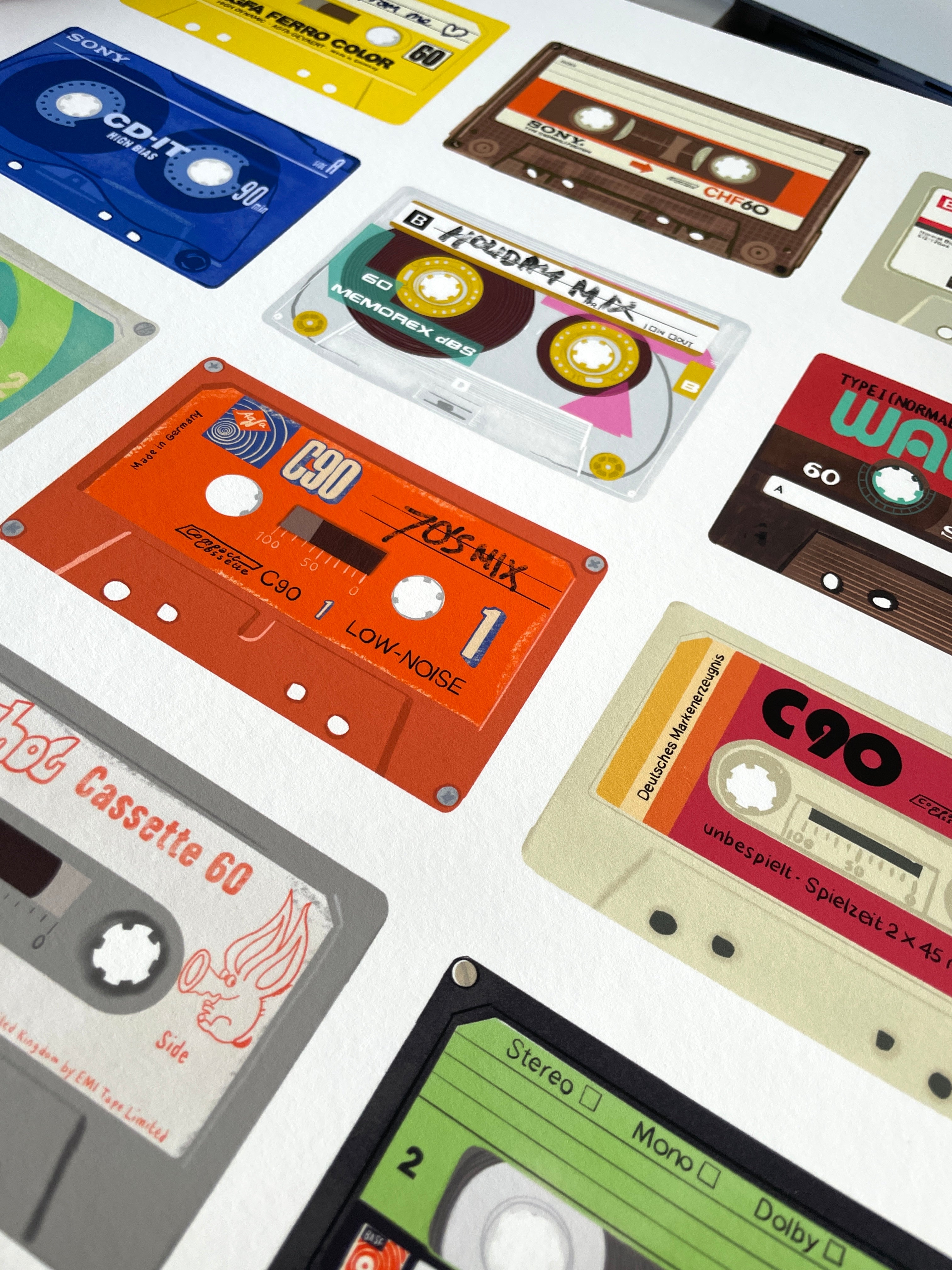 Printed in my studio on museum-grade 100% cotton rag paper. With its natural white tone, smooth soft-grain surface and premium etching coating, the paper brings warmth and movement to the artwork, echoing the depth and character of traditional fine art techniques. Perfect for music lovers, vintage enthusiasts, or anyone who remembers the art of making the perfect mixtape.