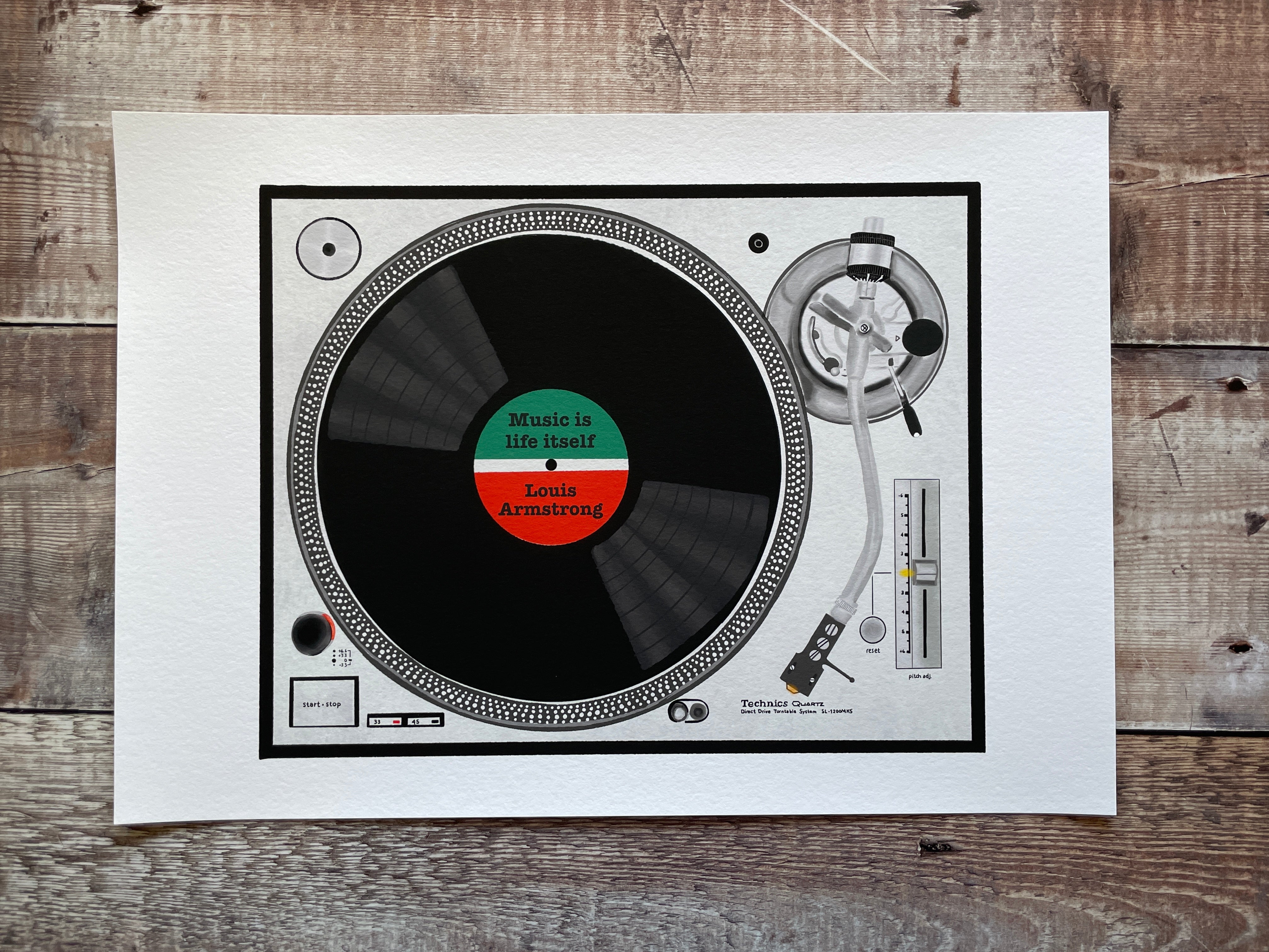 Embrace the timeless allure of music with our 'Music is Life Itself' Giclee Print. Featuring the iconic Technics SL-1200MK2 turntable and a powerful quote from Louis Armstrong on an illustrated LP vinyl record, this artwork pays homage to the birth of DJ culture and the enduring legacy of music. Elevate your space with a high-quality Giclee print that captures the essence of music's profound influence and its everlasting appeal. Perfect for music enthusiasts, this artwork is a statement piece that celebrates the heart and soul of music.