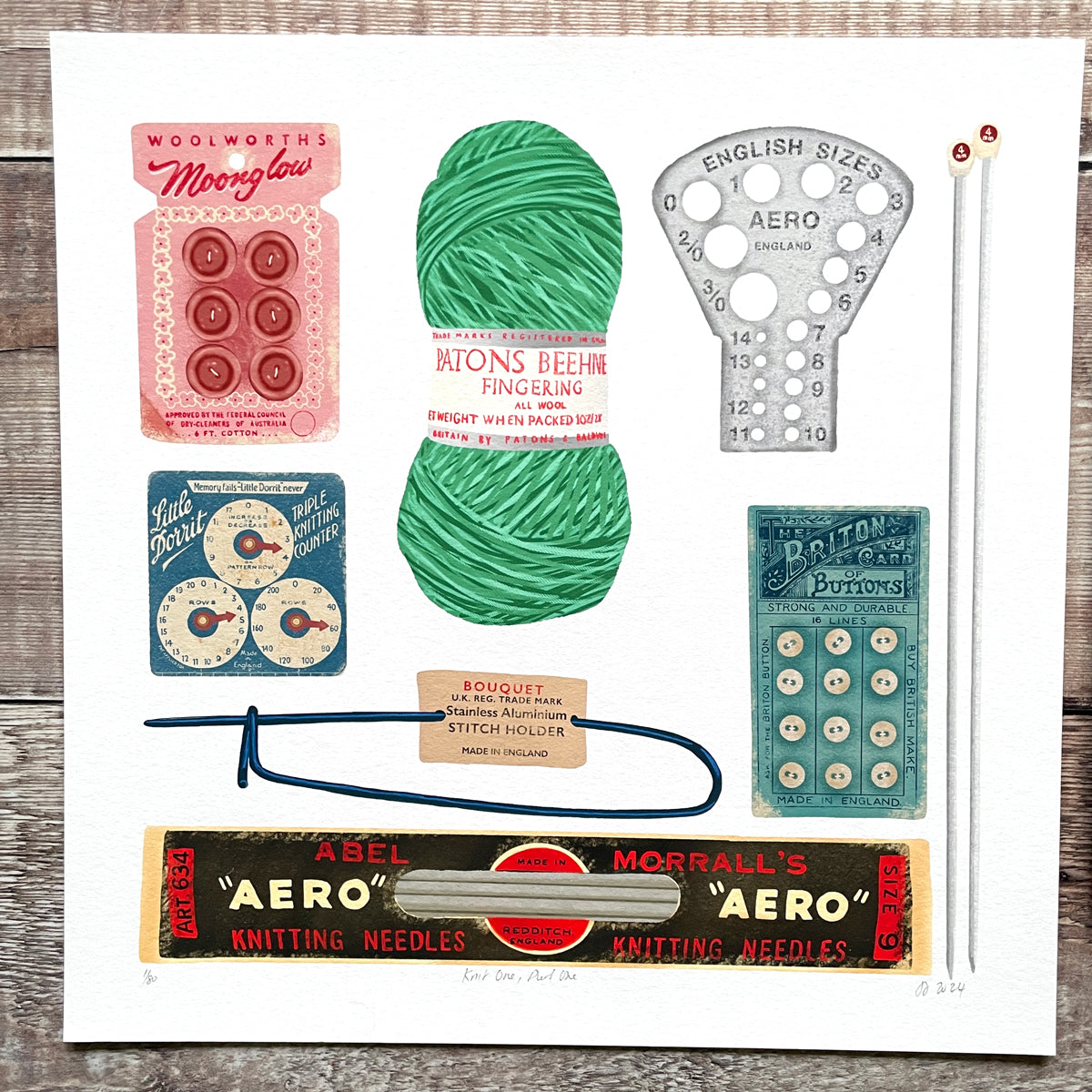 A limited-edition Giclee print of my 'Knit One, Purl One' original illustration, featuring a collection of vintage knitting tools and accessories.