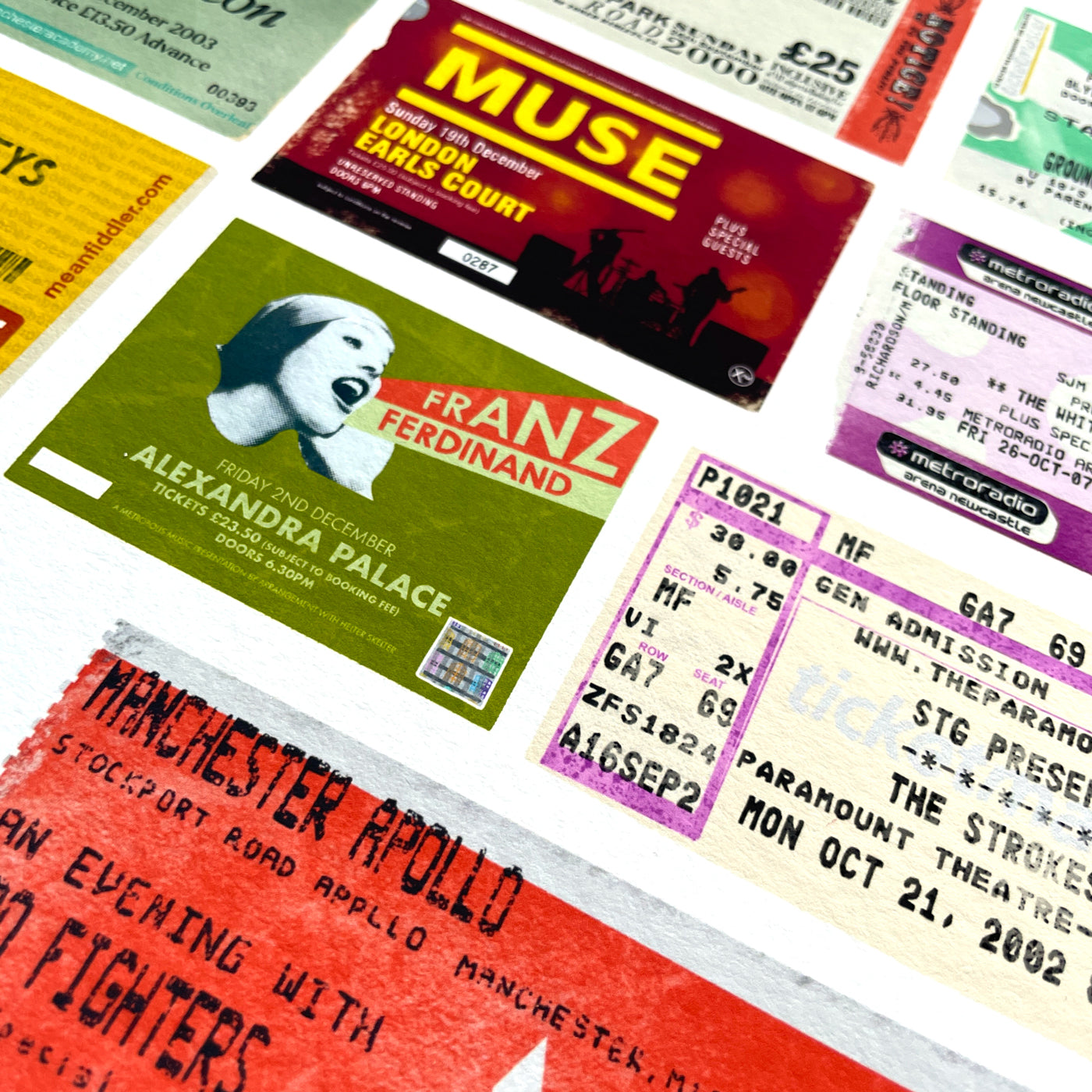 A limited-edition Giclée print of my Noughties illustration, showcasing a collection of gig tickets from iconic 2000s bands, including Franz Ferdinand, Stereophonics, The Strokes, Muse, and more.