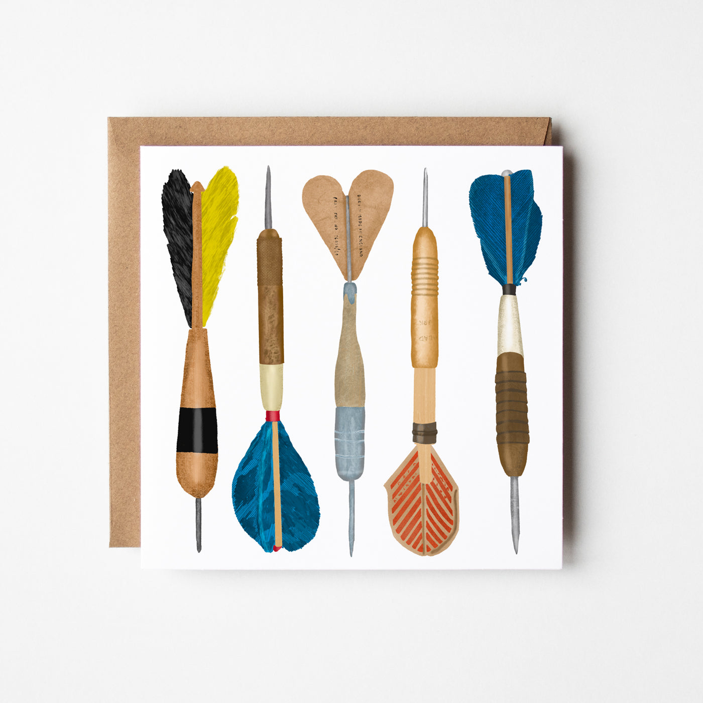 This greetings card features our 'Darts' illustration and features a finely detailed depiction of traditional vintage darts. Featuring feathered flights and weathered barrels, each dart reflects a history of countless games, making it a perfect piece for enthusiasts of darts and admirers of timeless pub sports aesthetics.