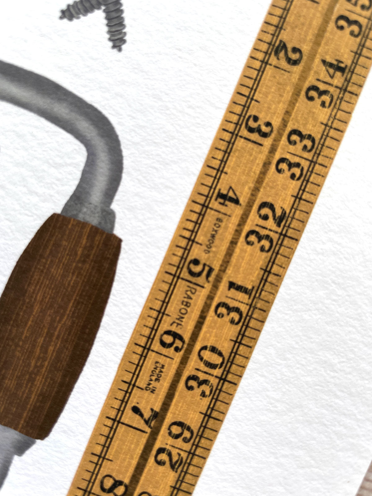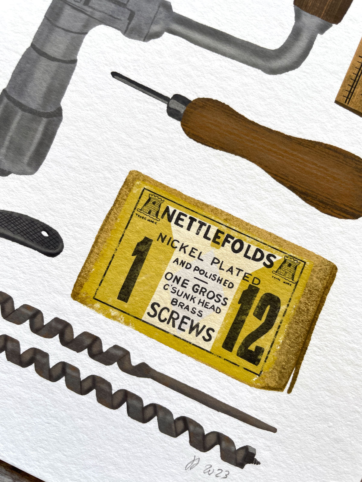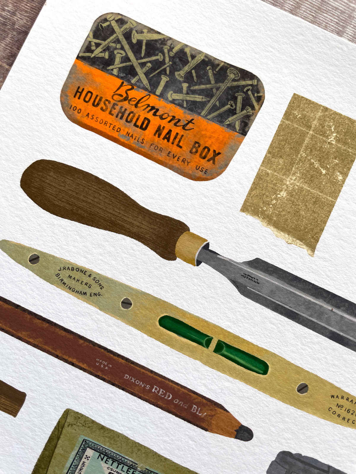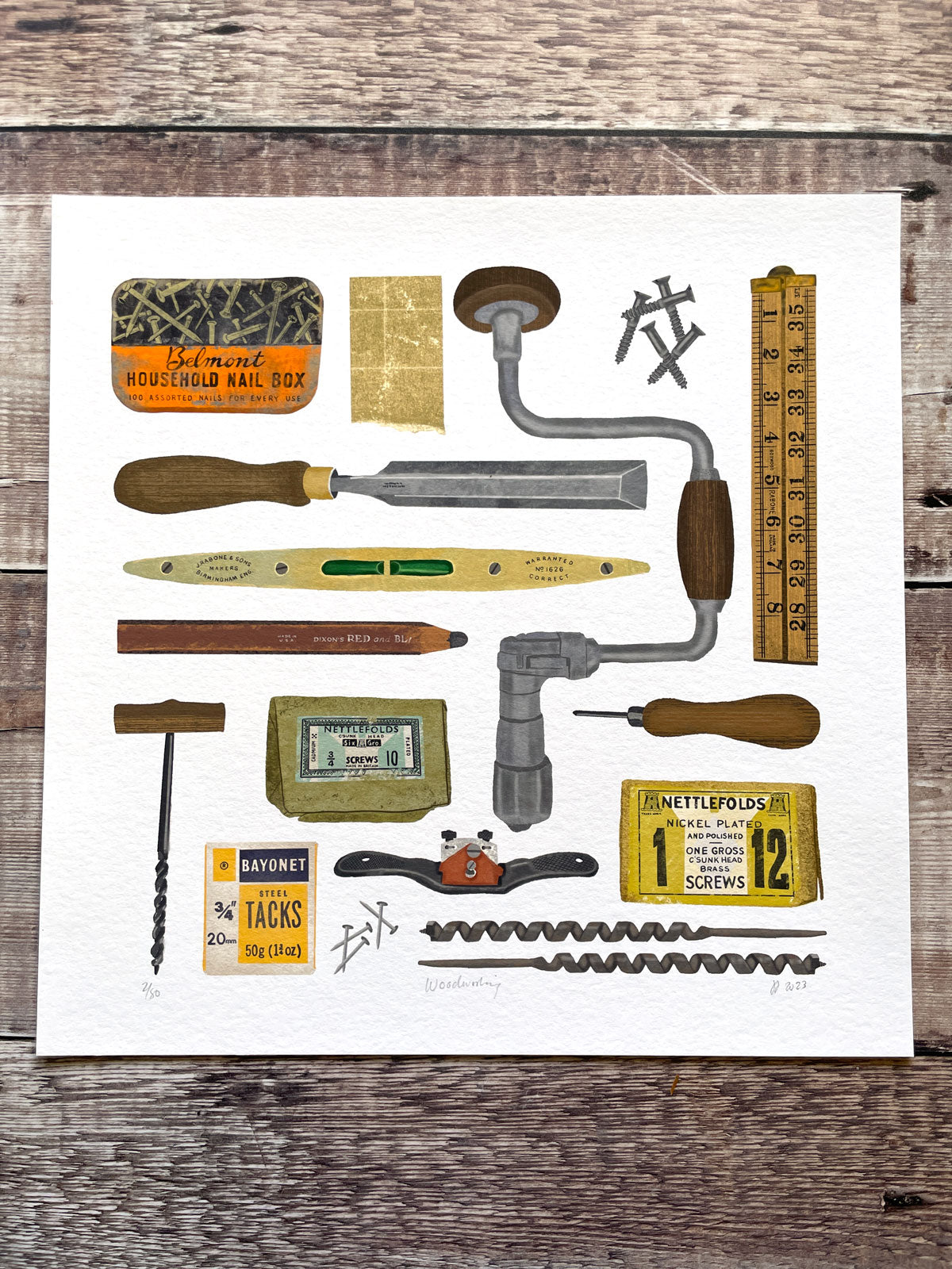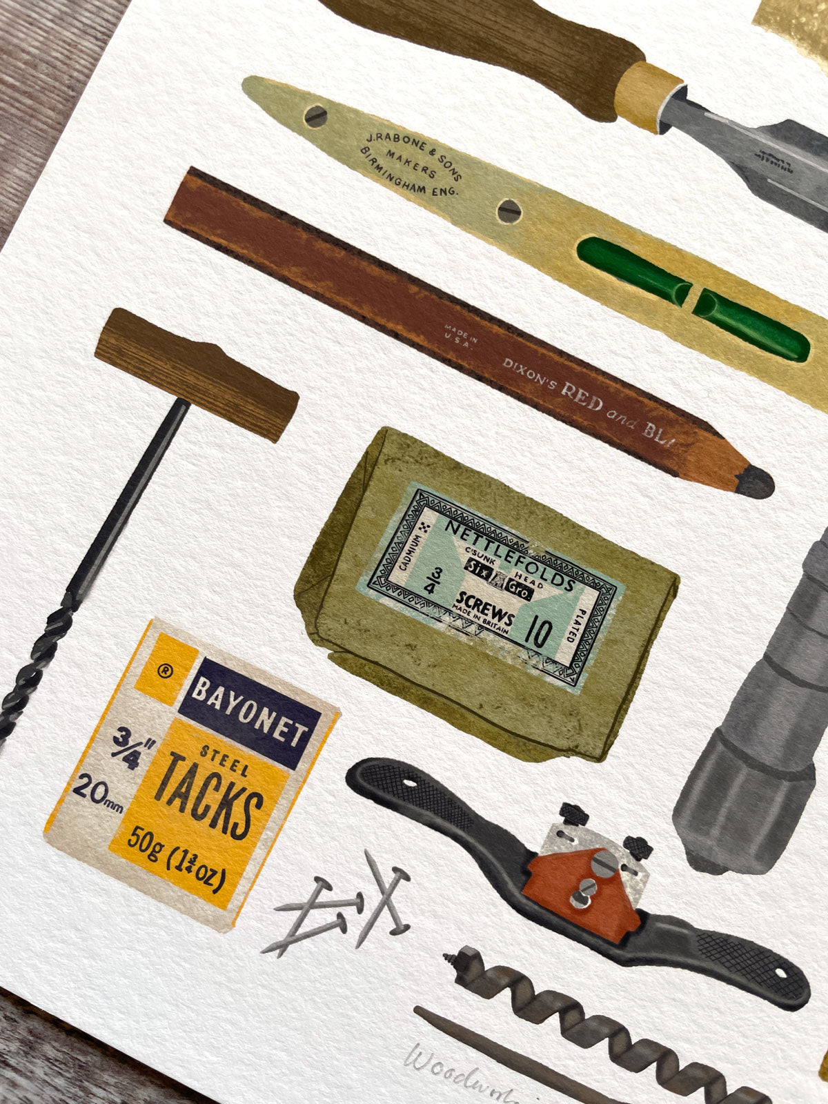 Discover the artistry of vintage woodworking with this limited-edition Giclee print. This captivating collection captures the essence of craftsmanship, showcasing a curated array of classic tools and charming odds and ends. Perfect for woodworking enthusiasts and those who appreciate the beauty of handcrafted history.